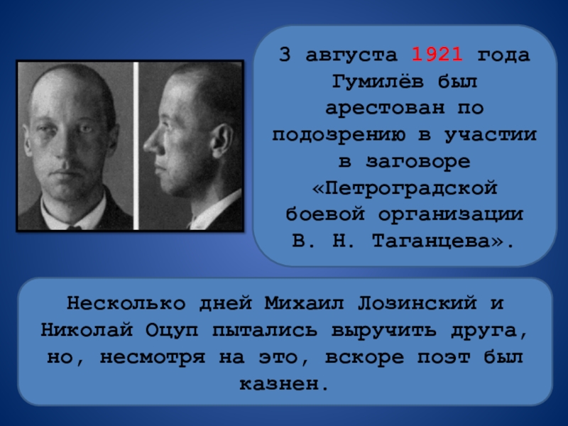 Несколько дней Михаил Лозинский и Николай Оцуп пытались выручить друга, но, несмотря на это, вскоре поэт был казнен.