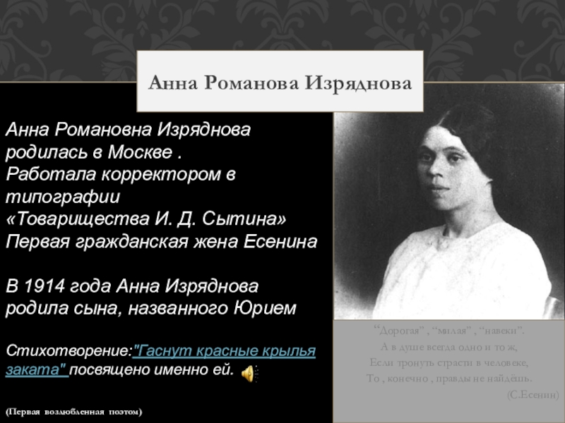 Стихотворение:"Гаснут красные крылья заката" посвящено именно ей.