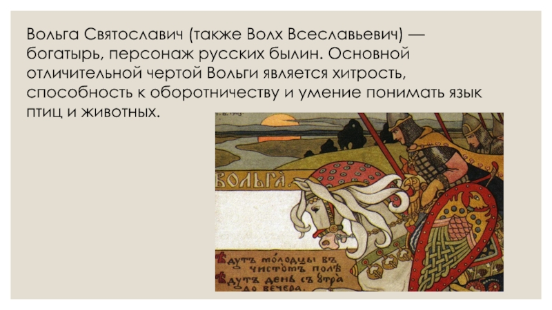 Слайд 8Вольга Святославич (также Волх Всеславьевич) — богатырь, персонаж русских былин. Основной