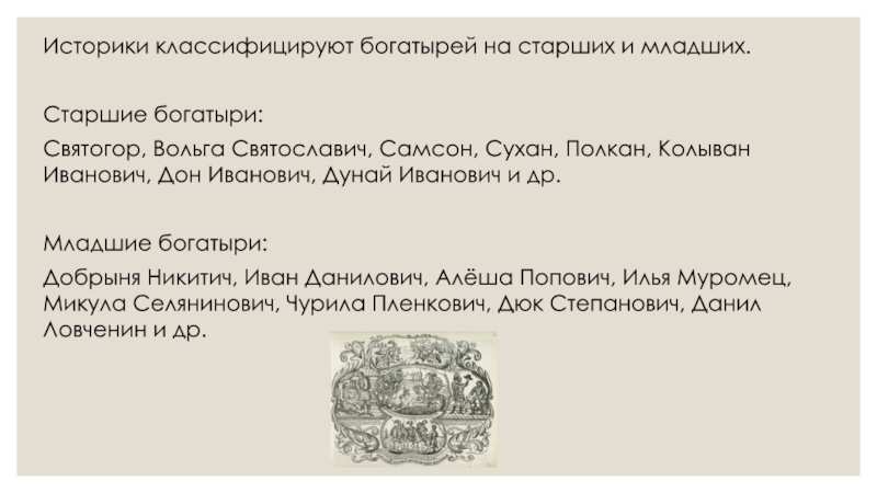 Слайд 2Историки классифицируют богатырей на старших и младших.