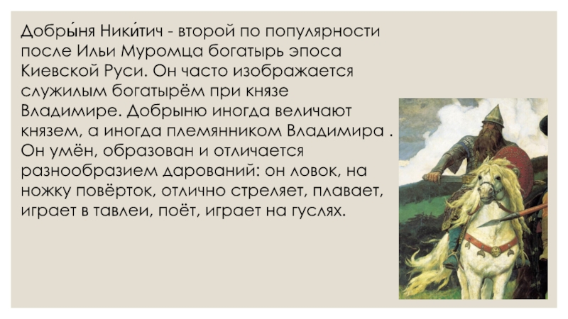 Слайд 6Добры́ня Ники́тич - второй по популярности после Ильи Муромца богатырь эпоса