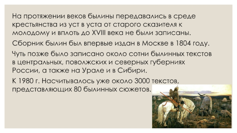 Слайд 9На протяжении веков былины передавались в среде крестьянства из уст в