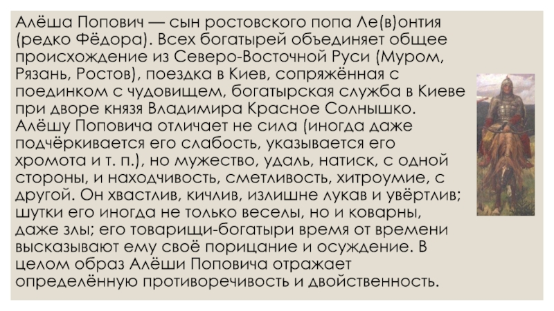 Слайд 5Алёша Попович — сын ростовского попа Ле(в)онтия (редко Фёдора). Всех богатырей