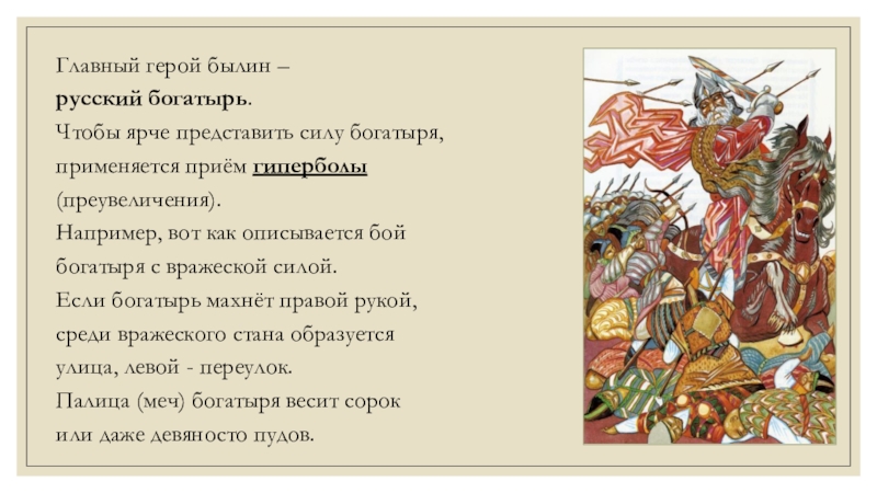 стать богатырю и его конь: «первый скок коня - на много вёрст, а второй скок - и найти нельзя». Чтобы подчеркнуть силу русского богатыря, гиперболически изображается его враг. Несметные силы врага «серому волку ... дня не обскакать, чёрному ворону в день не облететь».