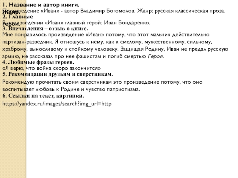Мне понравилось произведение «Иван» потому, что этот мальчик действительно партизан-разведчик. Я отношусь к нему, как к смелому, мужественному, сильному, храброму, выносливому и стойкому человеку. Защищая Родину, Иван не предал русскую армию, не рассказал про нее фашистам и погиб смертью Героя.