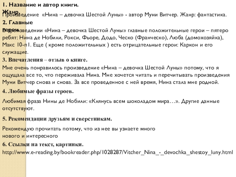Мне очень понравилось произведение «Нина – девочка Шестой Луны» потому, что я ощущала все то, что переживала Нина. Мне хочется читать и перечитывать произведения Муни Витчер снова и снова. За все проведенное с ней время, Нина стала мне родной.