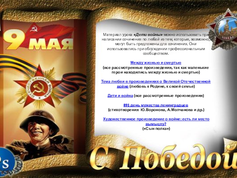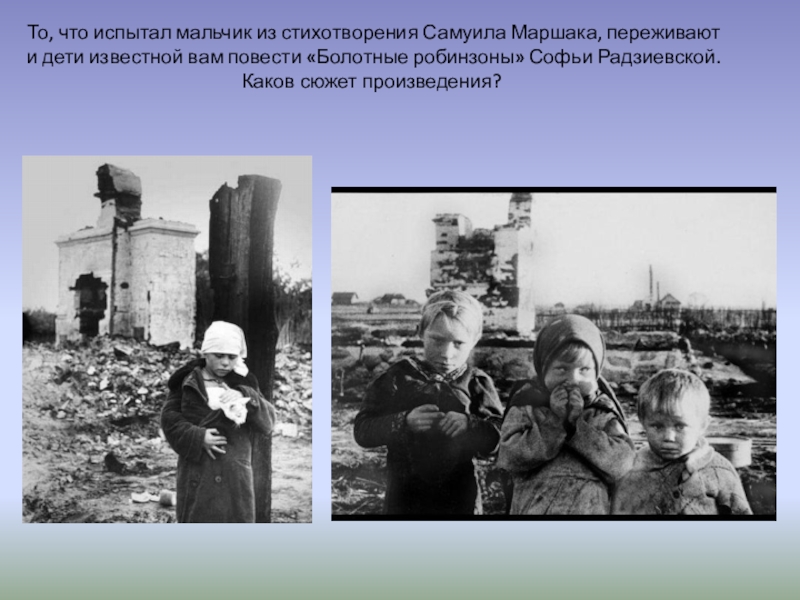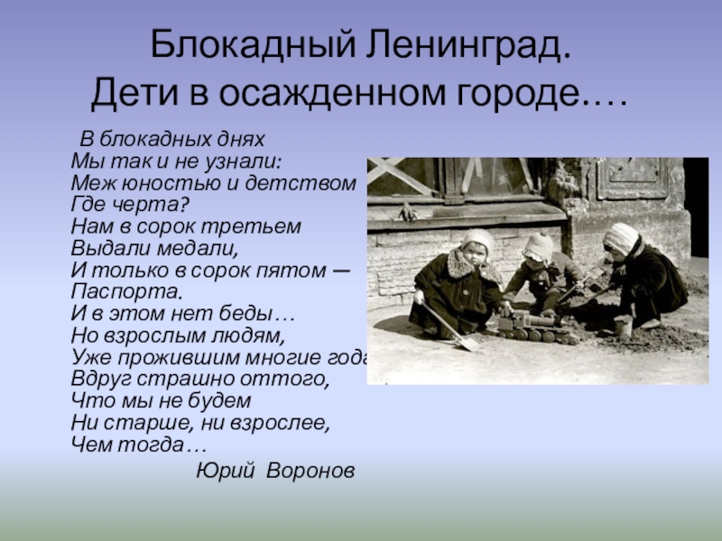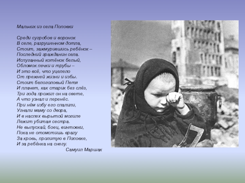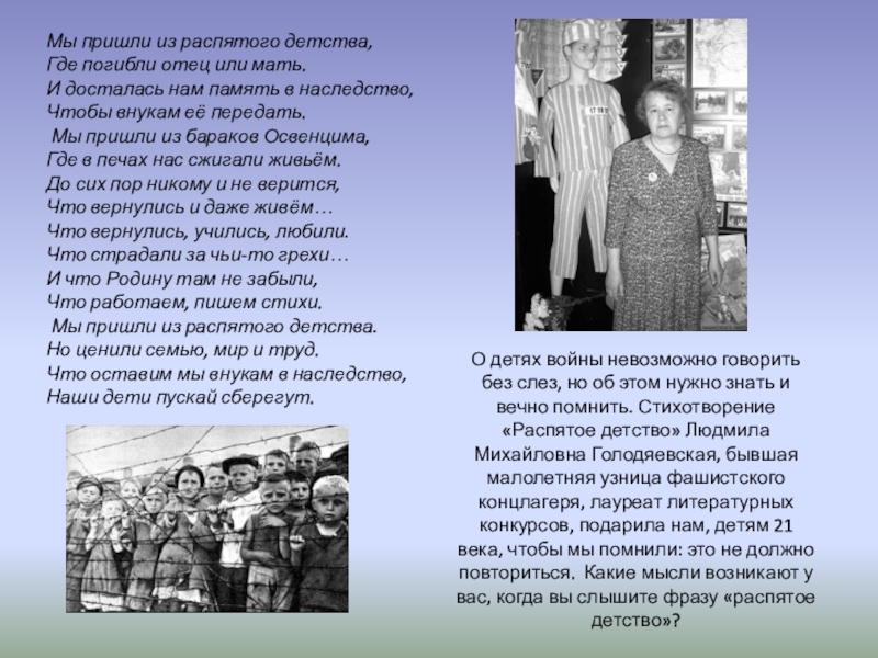 О детях войны невозможно говорить без слез, но об этом нужно знать и вечно помнить. Стихотворение «Распятое детство» Людмила Михайловна Голодяевская, бывшая малолетняя узница фашистского концлагеря, лауреат литературных конкурсов, подарила нам, детям 21 века, чтобы мы помнили: это не должно повториться. Какие мысли возникают у вас, когда вы слышите фразу «распятое детство»?
