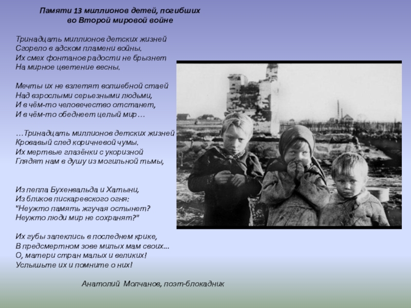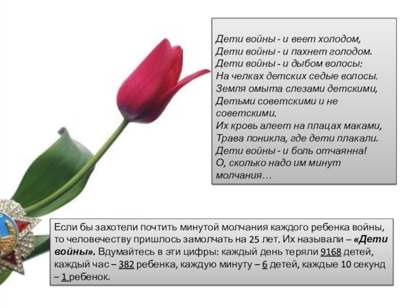 Если бы захотели почтить минутой молчания каждого ребенка войны, то человечеству пришлось замолчать на 25 лет. Их называли – «Дети войны». Вдумайтесь в эти цифры: каждый день теряли 9168 детей, каждый час – 382 ребенка, каждую минуту – 6 детей, каждые 10 секунд – 1 ребенок.