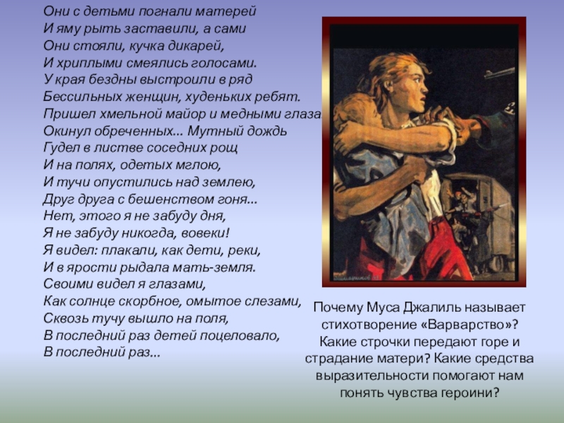 Почему Муса Джалиль называет стихотворение «Варварство»? Какие строчки передают горе и страдание матери? Какие средства выразительности помогают нам понять чувства героини?
