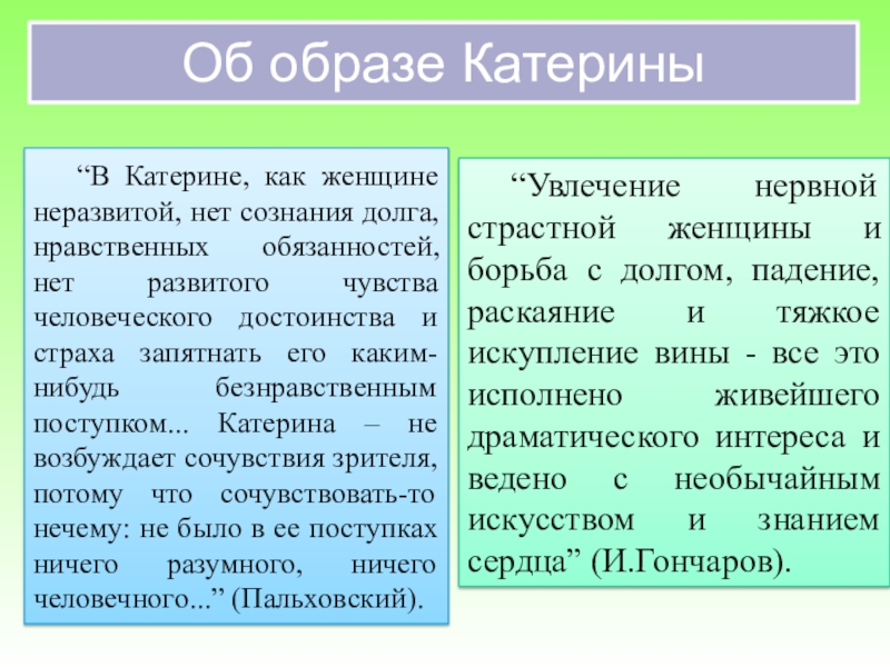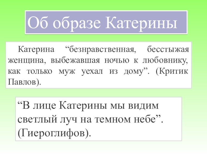 “В лице Катерины мы видим светлый луч на темном небе”. (Гиероглифов).