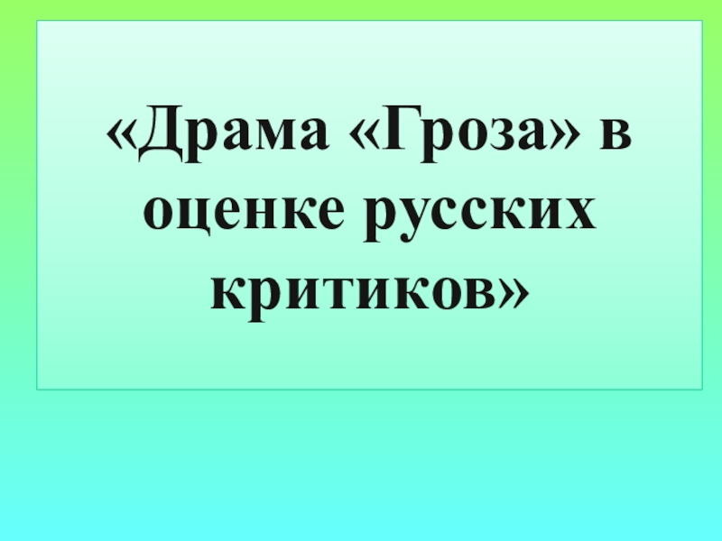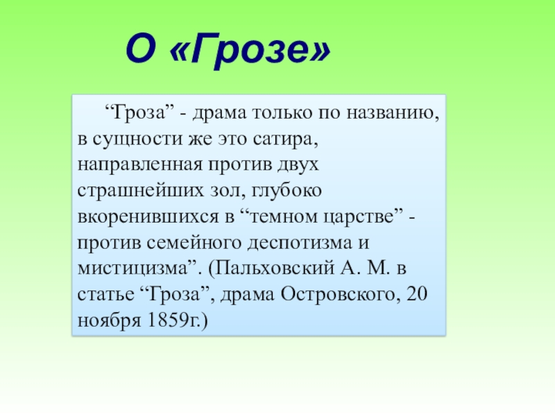 Драма Островского «Гроза» вызвала со стороны Добролюбова критическую статью под заглавием «Луч света в темном царстве». Эта статья была ошибкою со стороны Добролюбова; он увлекся симпатиею к характеру Катерины и принял ее личность за светлое явление.
