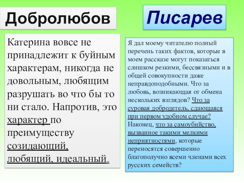 Катерина вовсе не принадлежит к буйным характерам, никогда не довольным, любящим разрушать во что бы то ни стало. Напротив, это характер по преимуществу созидающий, любящий, идеальный.