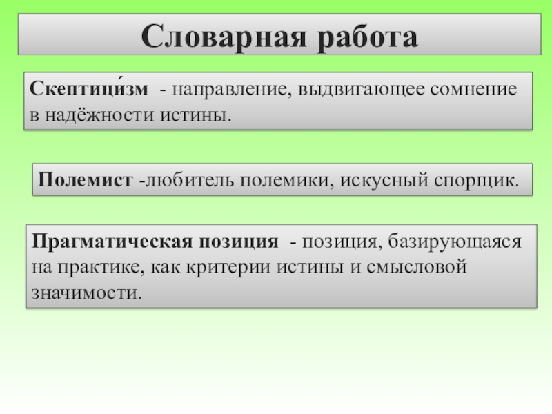 Скептици́зм - направление, выдвигающее сомнение в надёжности истины.