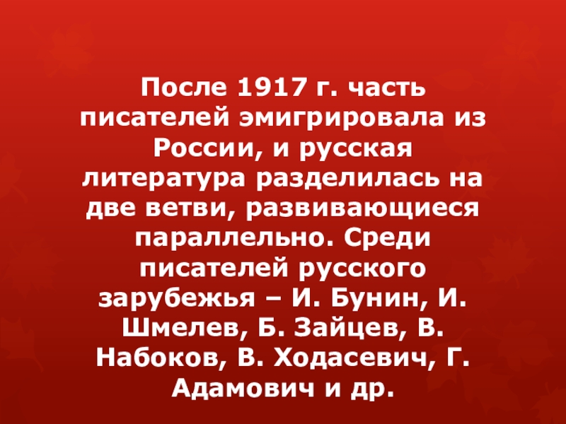 После 1917 г. часть писателей эмигрировала из России, и русская литература разделилась на две ветви, развивающиеся параллельно.