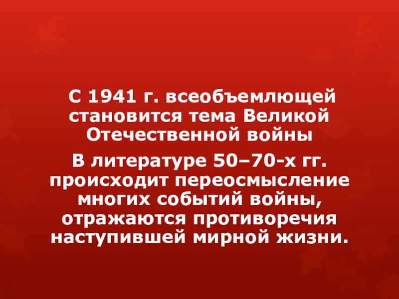 С 1941 г. всеобъемлющей становится тема Великой Отечественной войныВ литературе 50–70-х гг. происходит переосмысление многих событий