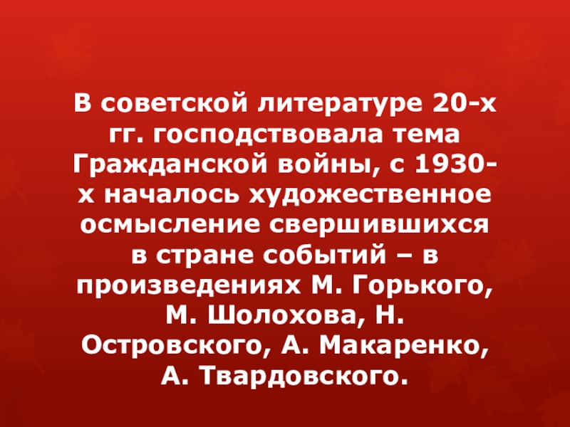 В советской литературе 20-х гг. господствовала тема Гражданской войны, с 1930-х