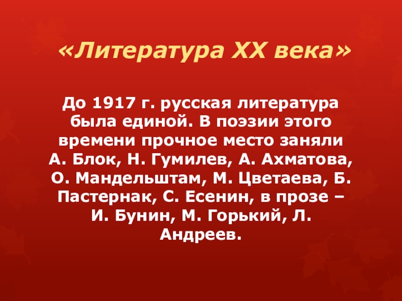 «Литература ХХ века»До 1917 г. русская литература была единой. В поэзии этого времени прочное место заняли