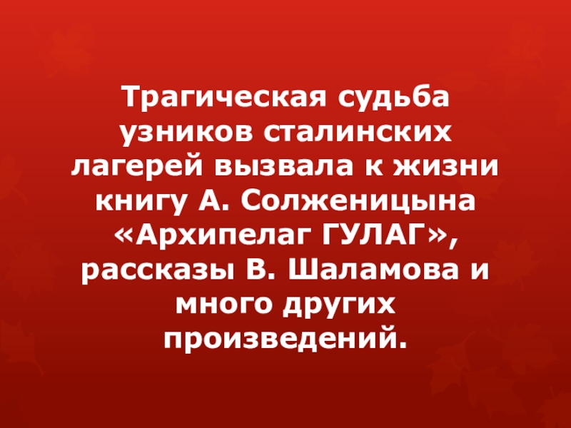Трагическая судьба узников сталинских лагерей вызвала к жизни книгу А. Солженицына «Архипелаг ГУЛАГ», рассказы В. Шаламова и