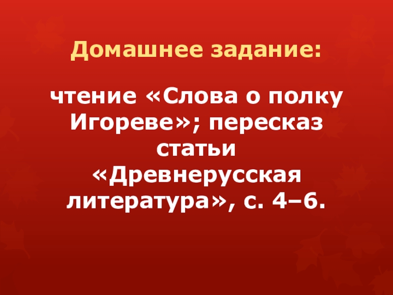 Домашнее задание: чтение «Слова о полку Игореве»; пересказ статьи «Древнерусская литература», с. 4–6.
