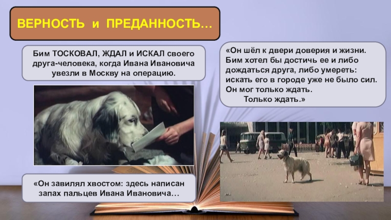 «И Бим шёл. Еле шёл, но все-таки шёл. На губах выступила кровь, а он шёл. … Спотыкался, припадая на колени, и шёл. Ложился от бессилия на холодную землю, вставал и вновь продвигался вперед.»