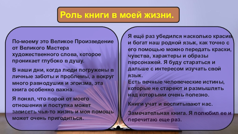 Я ещё раз убедился насколько красив и богат наш родной язык, как точно с его помощью можно передать краски, чувства, характеры и образы персонажей. Я буду стараться и дальше с интересом изучать свой язык.