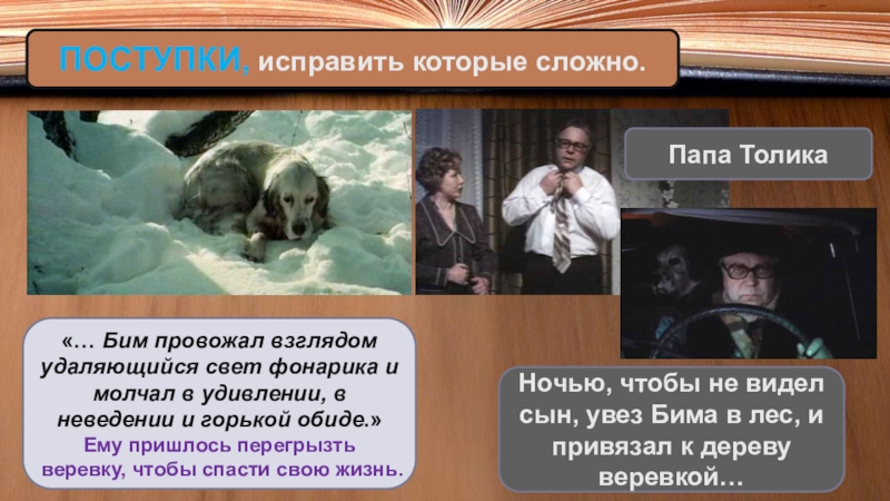 «… Бим провожал взглядом удаляющийся свет фонарика и молчал в удивлении, в неведении и горькой обиде.»