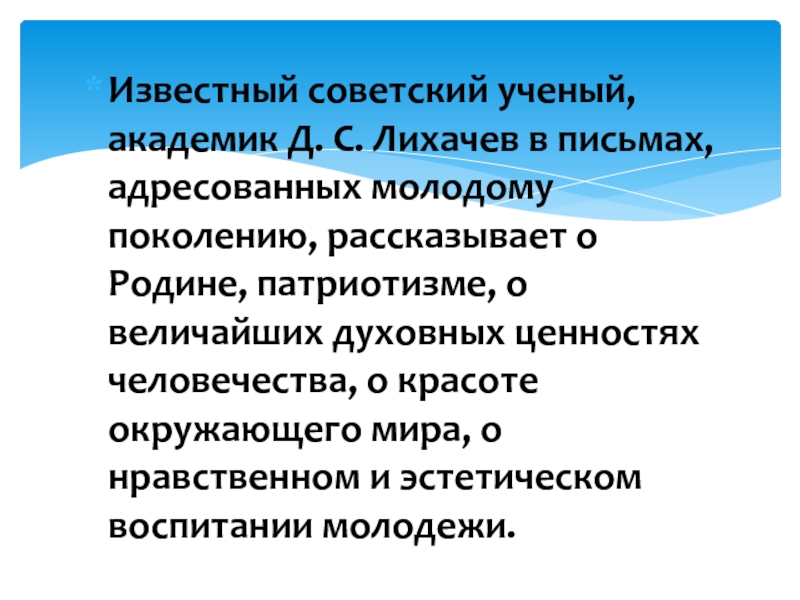 Слайд 3Известный советский ученый, академик Д. С. Лихачев в письмах, адресованных молодому