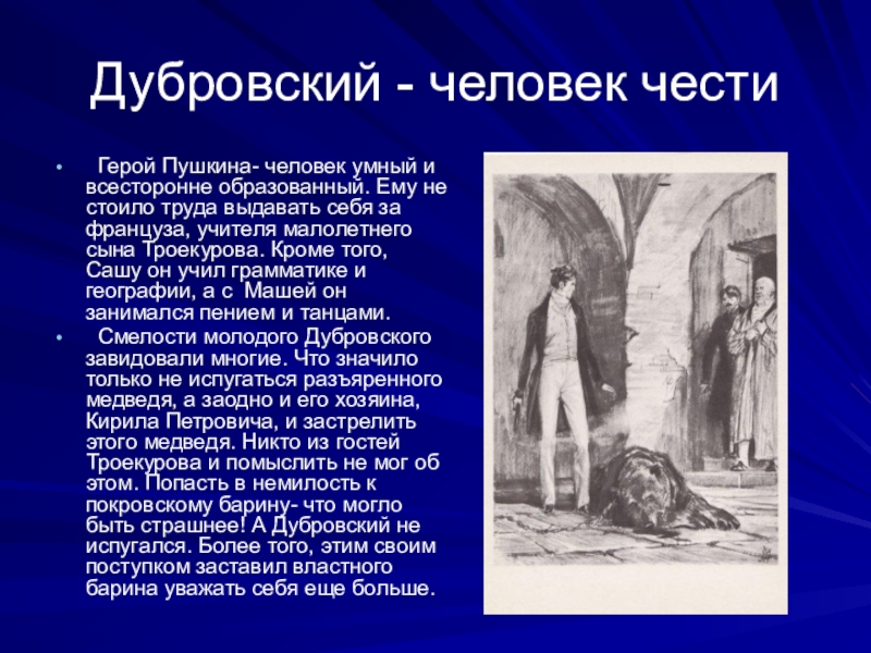 Ему не стоило труда выдавать себя за француза, учителя малолетнего сына Троекурова. Кроме того, Сашу он учил грамматике и географии, а с Машей он занимался пением и танцами.