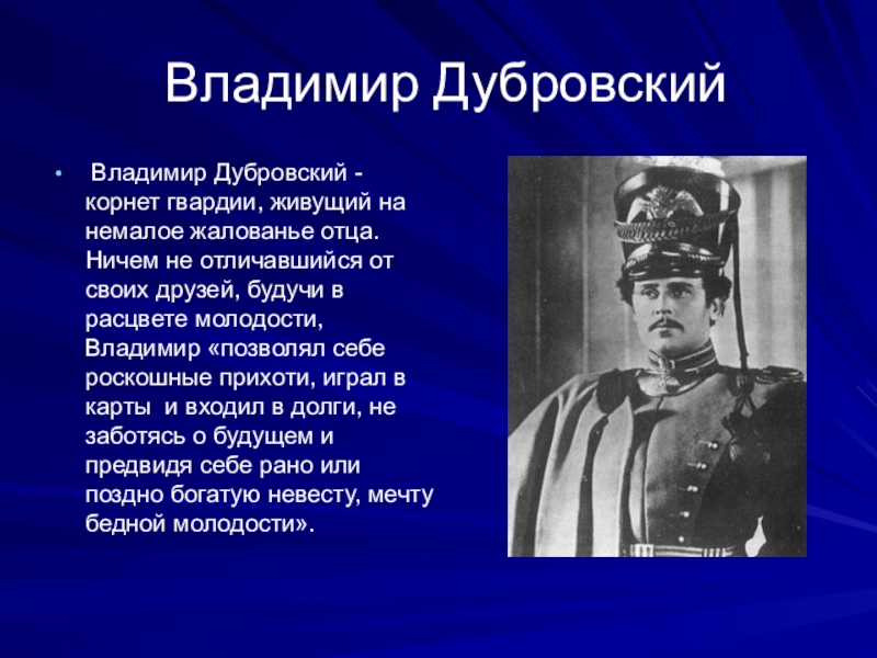 Владимир Дубровский - корнет гвардии, живущий на немалое