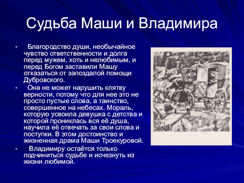 Она не может нарушить клятву верности, потому что для нее это не просто пустые слова, а таинство, совершенное на небесах. Мораль, которую усвоила девушка с детства и которой прониклась вся её душа, научила её отвечать за свои слова и поступки. В этом достоинство и жизненная драма Маши Троекуровой.