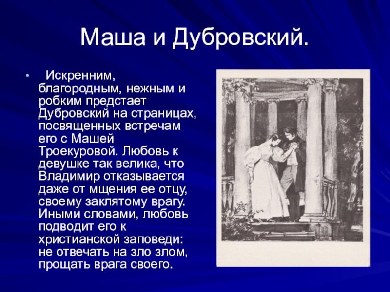 страницах, посвященных встречам его с Машей Троекуровой. Любовь к девушке так велика, что Владимир отказывается даже от мщения ее отцу, своему заклятому врагу. Иными словами, любовь подводит его к христианской заповеди: не отвечать на зло злом, прощать врага своего.