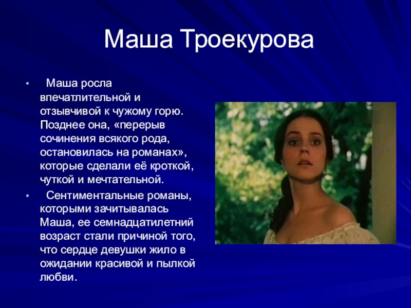 Сентиментальные романы, которыми зачитывалась Маша, ее семнадцатилетний возраст стали причиной того, что сердце девушки жило в ожидании красивой и пылкой любви.