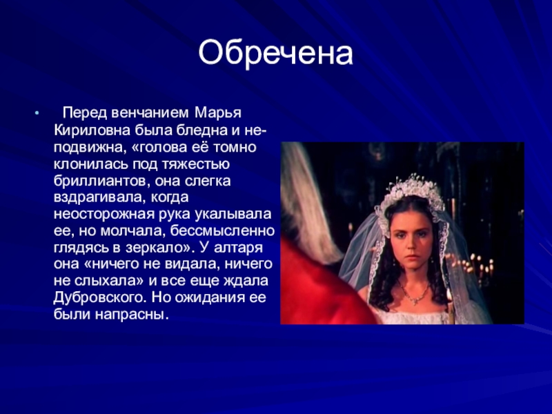 её томно клонилась под тяжестью бриллиантов, она слегка вздрагивала, когда неосторожная рука укалывала ее, но молчала, бессмысленно глядясь в зеркало». У алтаря она «ничего не видала, ничего не слыхала» и все еще ждала Дубровского. Но ожидания ее были напрасны.