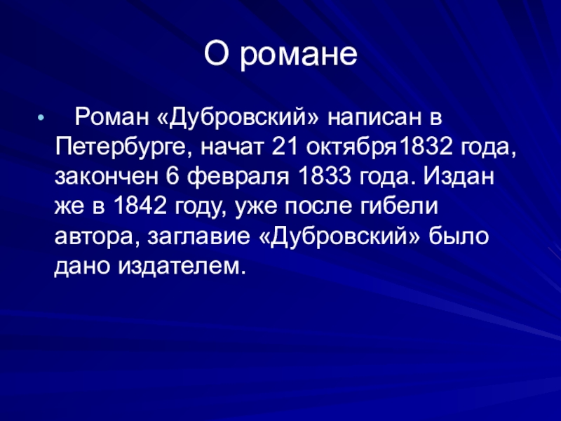 года, закончен 6 февраля 1833 года. Издан же в 1842 году, уже после гибели автора, заглавие «Дубровский» было дано издателем.