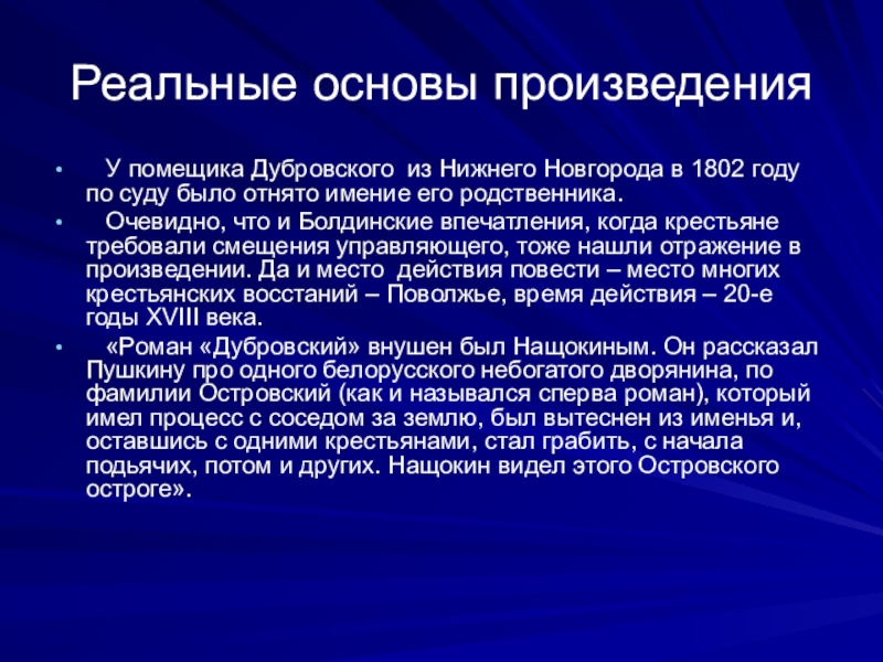 «Роман «Дубровский» внушен был Нащокиным. Он рассказал Пушкину про одного белорусского небогатого дворянина, по фамилии Островский (как и назывался сперва роман), который имел процесс с соседом за землю, был вытеснен из именья и, оставшись с одними крестьянами, стал грабить, с начала подьячих, потом и других. Нащокин видел этого Островского остроге».