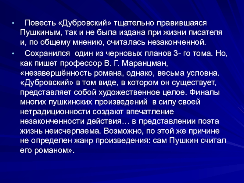 Сохранился один из черновых планов 3- го тома. Но, как пишет профессор В. Г. Маранцман, «незавершённость романа, однако, весьма условна. «Дубровский» в том виде, в котором он существует, представляет собой художественное целое. Финалы многих пушкинских произведений в силу своей нетрадиционности создают впечатление незаконченности действия… в представлении поэта жизнь неисчерпаема. Возможно, по этой же причине не определен жанр произведения: сам Пушкин считал его романом».