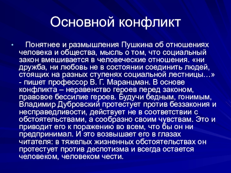 общества, мысль о том, что социальный закон вмешивается в человеческие отношения. «ни дружба, ни любовь не в состоянии соединить людей, стоящих на разных ступенях социальной лестницы…»- пишет профессор В. Г. Маранцман. В основе конфликта – неравенство героев перед законом, правовое бессилие героев. Будучи бедным, гонимым, Владимир Дубровский протестует против беззакония и несправедливости, действует не в соответствии с обстоятельствами, а сообразно своим чувствам. Это и приводит его к поражению во всем, что бы он ни предпринимал. И это возвышает его в глазах читателя: в тяжелых жизненных обстоятельствах он протестует против деспотизма и всегда остается человеком, человеком чести.