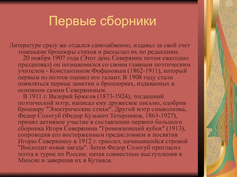 В 1911 г. Валерий Брюсов (1873-1924), тогдашний поэтический мэтр, написал ему дружеское письмо, одобрив брошюру "Электрические стихи". Другой мэтр символизма, Федор Сологуб (Федор Кузьмич Тетерников, 1863-1927), принял активное участие в составлении первого большого сборника Игоря Северянина "Громокипящий кубок" (1913), сопроводив его восторженным предисловием и посвятив Игорю Северянину в 1912 г. триолет, начинавшийся строкой "Восходит новая звезда". Затем Федор Сологуб пригласил поэта в турне по России, начав совместные выступления в Минске и завершив их в Кутаиси.
