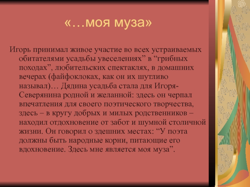 в “грибных походах”, любительских спектаклях, в домашних вечерах (файфоклоках, как он их шутливо называл)… Дядина усадьба стала для Игоря-Северянина родной и желанной: здесь он черпал впечатления для своего поэтического творчества, здесь – в кругу добрых и милых родственников – находил отдохновение от забот и шумной столичной жизни. Он говорил о здешних местах: “У поэта должны быть народные корни, питающие его вдохновение. Здесь мне является моя муза”.
