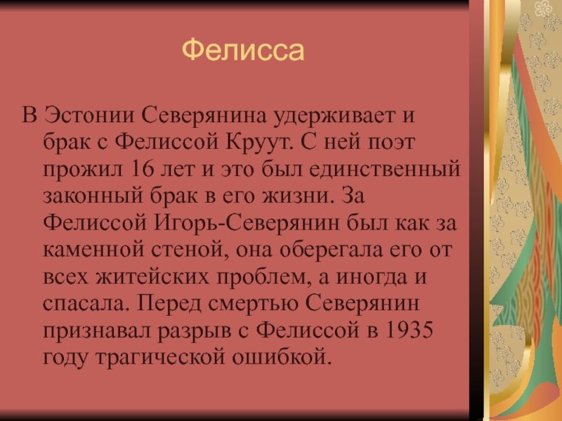 поэт прожил 16 лет и это был единственный законный брак в его жизни. За Фелиссой Игорь-Северянин был как за каменной стеной, она оберегала его от всех житейских проблем, а иногда и спасала. Перед смертью Северянин признавал разрыв с Фелиссой в 1935 году трагической ошибкой.