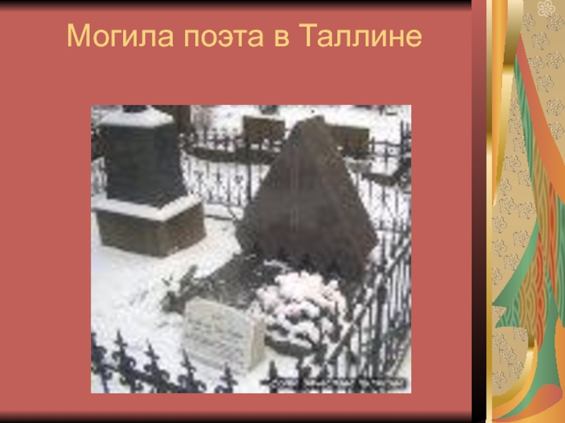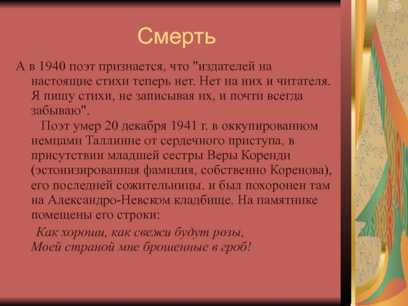 Поэт умер 20 декабря 1941 г. в оккупированном немцами Таллинне от сердечного приступа, в присутствии младшей сестры Веры Коренди (эстонизированная фамилия, собственно Коренова), его последней сожительницы. и был похоронен там на Александро-Невском кладбище. На памятнике помещены его строки: