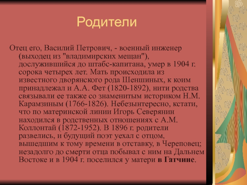 дослужившийся до штабс-капитана, умер в 1904 г. сорока четырех лет. Мать происходила из известного дворянского рода Шеншиных, к коим принадлежал и А.А. Фет (1820-1892), нити родства связывали ее также со знаменитым историком Н.М. Карамзиным (1766-1826). Небезынтересно, кстати, что по материнской линии Игорь Северянин находился в родственных отношениях с А.М. Коллонтай (1872-1952). В 1896 г. родители развелись, и будущий поэт уехал с отцом, вышедшим к тому времени в отставку, в Череповец; незадолго до смерти отца побывал с ним на Дальнем Востоке и в 1904 г. поселился у матери в Гатчине.