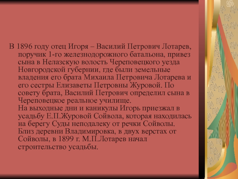 В 1896 году отец Игоря – Василий Петрович Лотарев, поручик 1-го