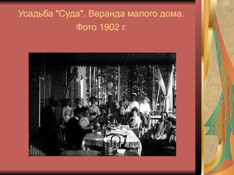 Слайд 9Усадьба "Суда". Веранда малого дома. Фото 1902 г.