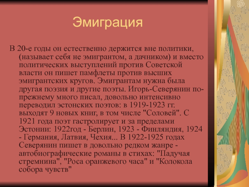 эмигрантом, а дачником) и вместо политических выступлений против Советской власти он пишет памфлеты против высших эмигрантских кругов. Эмигрантам нужна была другая поэзия и другие поэты. Игорь-Северянин по-прежнему много писал, довольно интенсивно переводил эстонских поэтов: в 1919-1923 гг. выходят 9 новых книг, в том числе "Соловей". С 1921 года поэт гастролирует и за пределами Эстонии: 1922год - Берлин, 1923 - Финляндия, 1924 - Германия, Латвия, Чехия... В 1922-1925 годах Северянин пишет в довольно редком жанре - автобиографические романы в стихах: "Падучая стремнина", "Роса оранжевого часа" и "Колокола собора чувств"