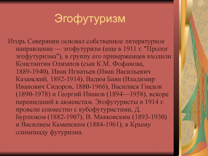 г. "Пролог эгофутуризма"), в группу его приверженцев входили Константин Олимпов (сын К.М. Фофанова, 1889-1940), Иван Игнатьев (Иван Васильевич Казанский, 1892-1914), Вадим Баян (Владимир Иванович Сидоров, 1880-1966), Василиск Гнедов (1890-1978) и Георгий Иванов (1894—1958), вскоре перешедший к акмеистам. Эгофутуристы в 1914 г. провели совместно с кубофутуристами, Д. Бурлюком (1882-1907), В. Маяковским (1893-1930) и Василием Каменским (1884-1961), в Крыму олимпиаду футуризма.