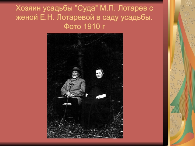Слайд 7Хозяин усадьбы "Суда" М.П. Лотарев с женой Е.Н. Лотаревой в саду