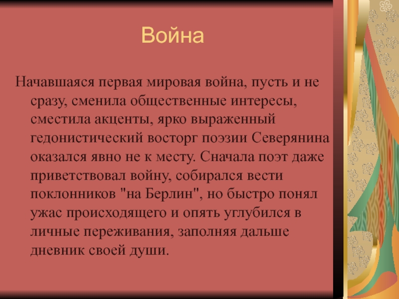сместила акценты, ярко выраженный гедонистический восторг поэзии Северянина оказался явно не к месту. Сначала поэт даже приветствовал войну, собирался вести поклонников "на Берлин", но быстро понял ужас происходящего и опять углубился в личные переживания, заполняя дальше дневник своей души.