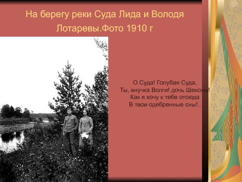 Слайд 8На берегу реки Суда Лида и Володя Лотаревы.Фото 1910 г