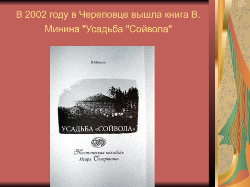 Слайд 25В 2002 году в Череповце вышла книга В. Минина "Усадьба "Сойвола"